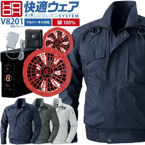 【即日発送】快適ウェア 空調服 基本セット フルハーネス対応 長袖ブルゾン V8201 バッテリー 充電器 ファン ハーネス V8101 V9102 肩パット 綿100% 春夏用 作業服 鳳皇 村上被服 6L-8L